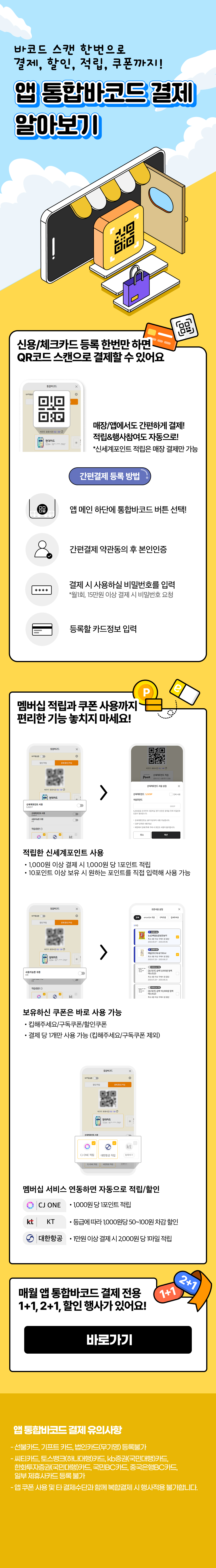 매월 앱 통합바코드 결제 전용 1+1, 2+1, 할인 행사가 있어요!