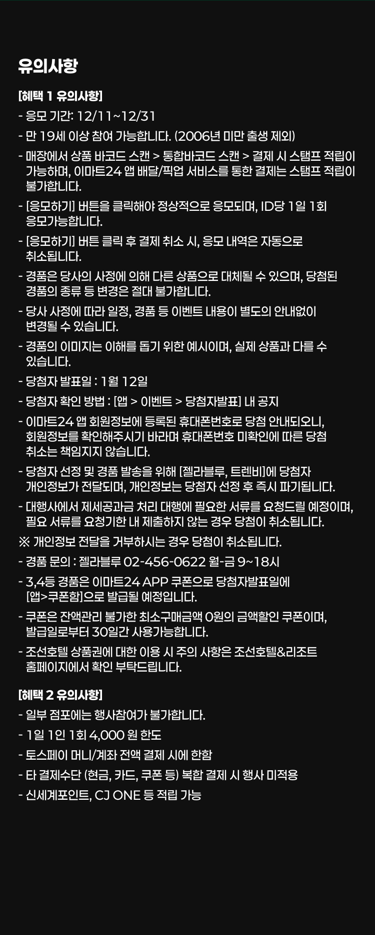- 이마트24 앱 회원정보에 등록된 휴대폰번호로 당첨 안내되오니, 회원정보를 확인해주시기 바라며 휴대폰번호 미확인에 따른 당첨 취소는 책임지지 않습니다.