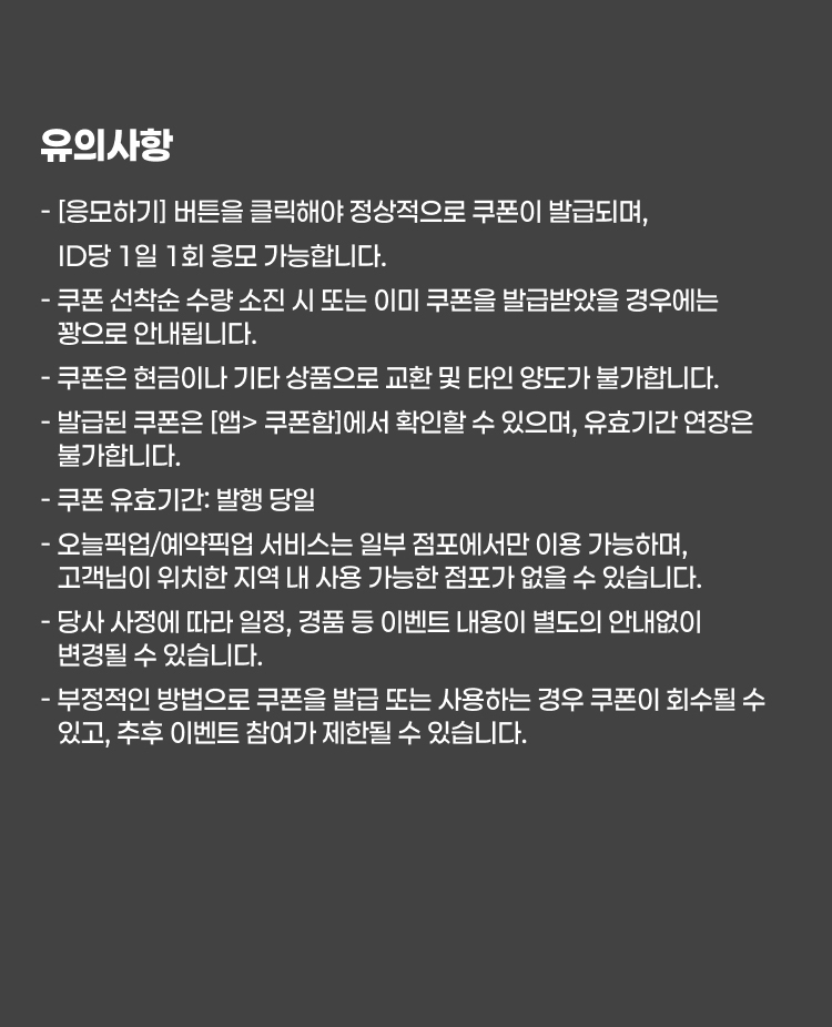 - 부정적인 방법으로 쿠폰을 발급 또는 사용하는 경우 쿠폰이 회수될 수 있고, 추후 이벤트 참여가 제한될 수 있습니다.