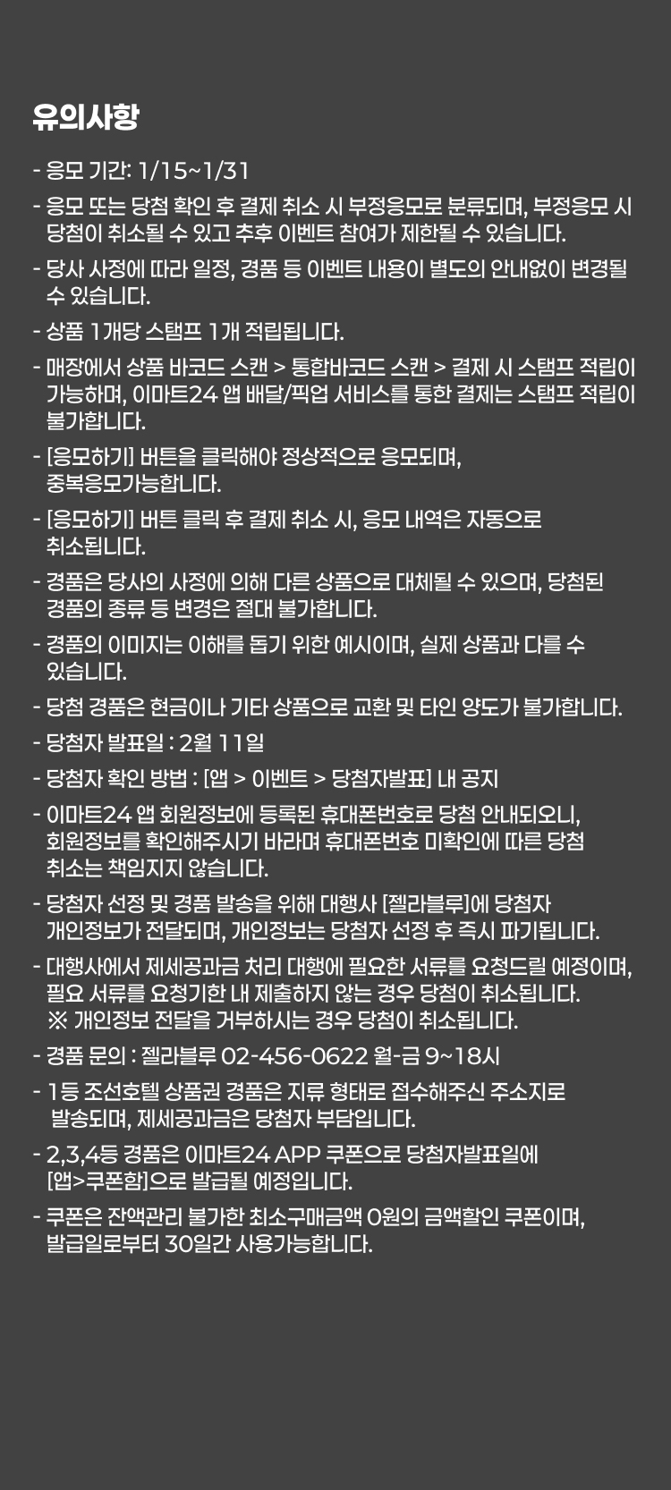 - 이마트24 앱 회원정보에 등록된 휴대폰번호로 당첨 안내되오니, 회원정보를 확인해주시기 바라며 휴대폰번호 미확인에 따른 당첨 취소는 책임지지 않습니다.