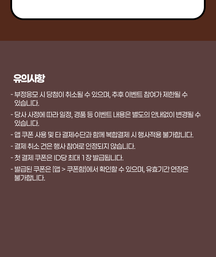 - 앱 쿠폰 사용 및 타 결제수단과 함께 복합결제 시 행사적용 불가합니다.