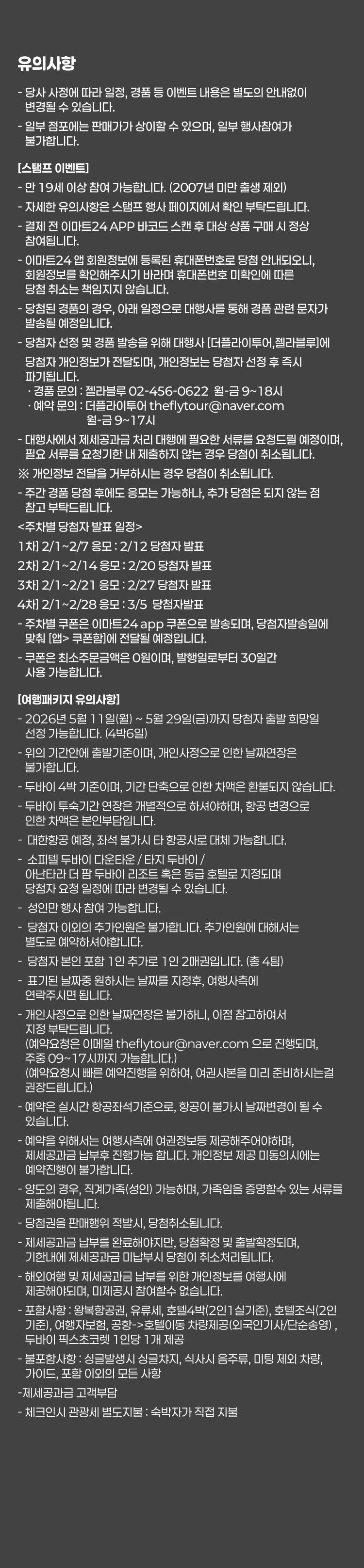 - 당첨자 선정 및 경품 발송을 위해 대행사 [더플라이투어,젤라블루]에 당첨자 개인정보가 전달되며, 개인정보는 당첨자 선정 후 즉시 파기됩니다.