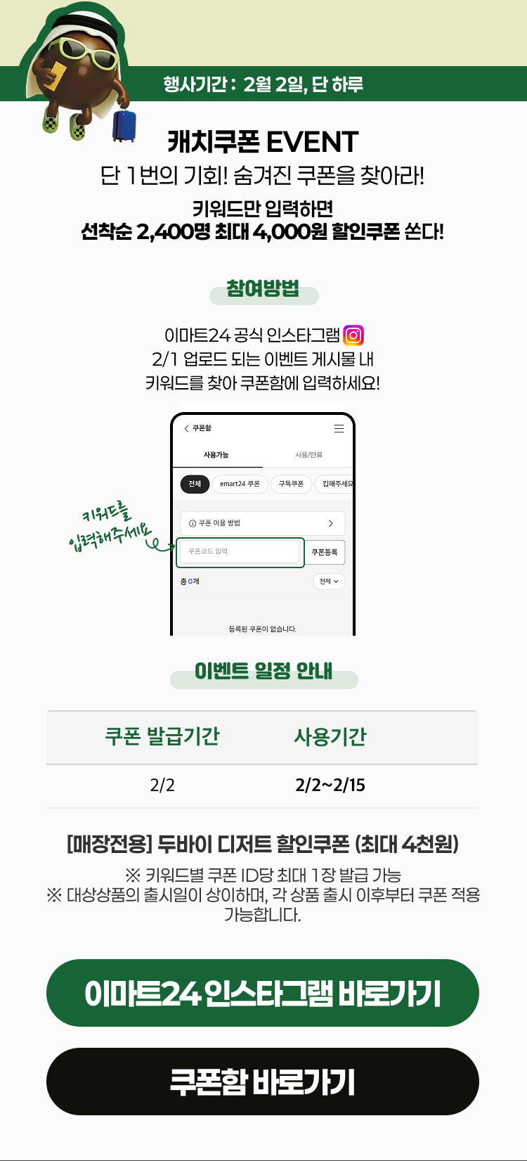 - 주차별 쿠폰은 이마트24 app 쿠폰으로 발송되며, 당첨자발송일에 맞춰 [앱> 쿠폰함]에 전달될 예정입니다.