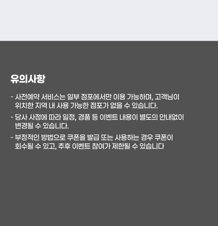 - 부정적인 방법으로 쿠폰을 발급 또는 사용하는 경우 쿠폰이 회수될 수 있고, 추후 이벤트 참여가 제한될 수 있습니다