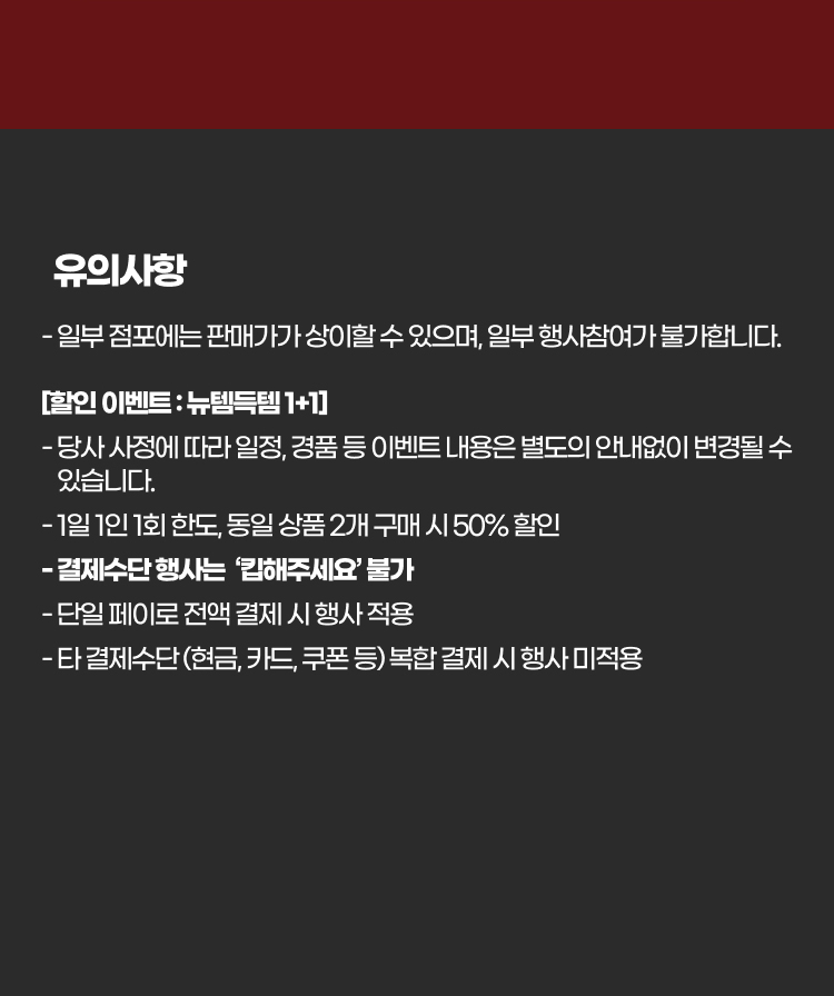 - 타 결제수단 (현금, 카드, 쿠폰 등) 복합 결제 시 행사 미적용