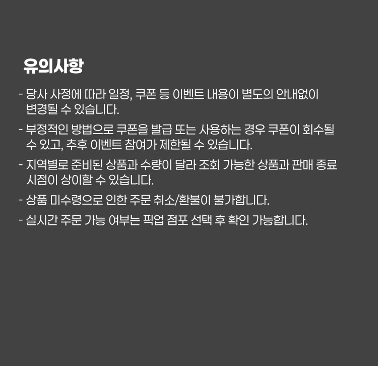 - 당사 사정에 따라 일정, 쿠폰 등 이벤트 내용이 별도의 안내없이 변경될 수 있습니다.