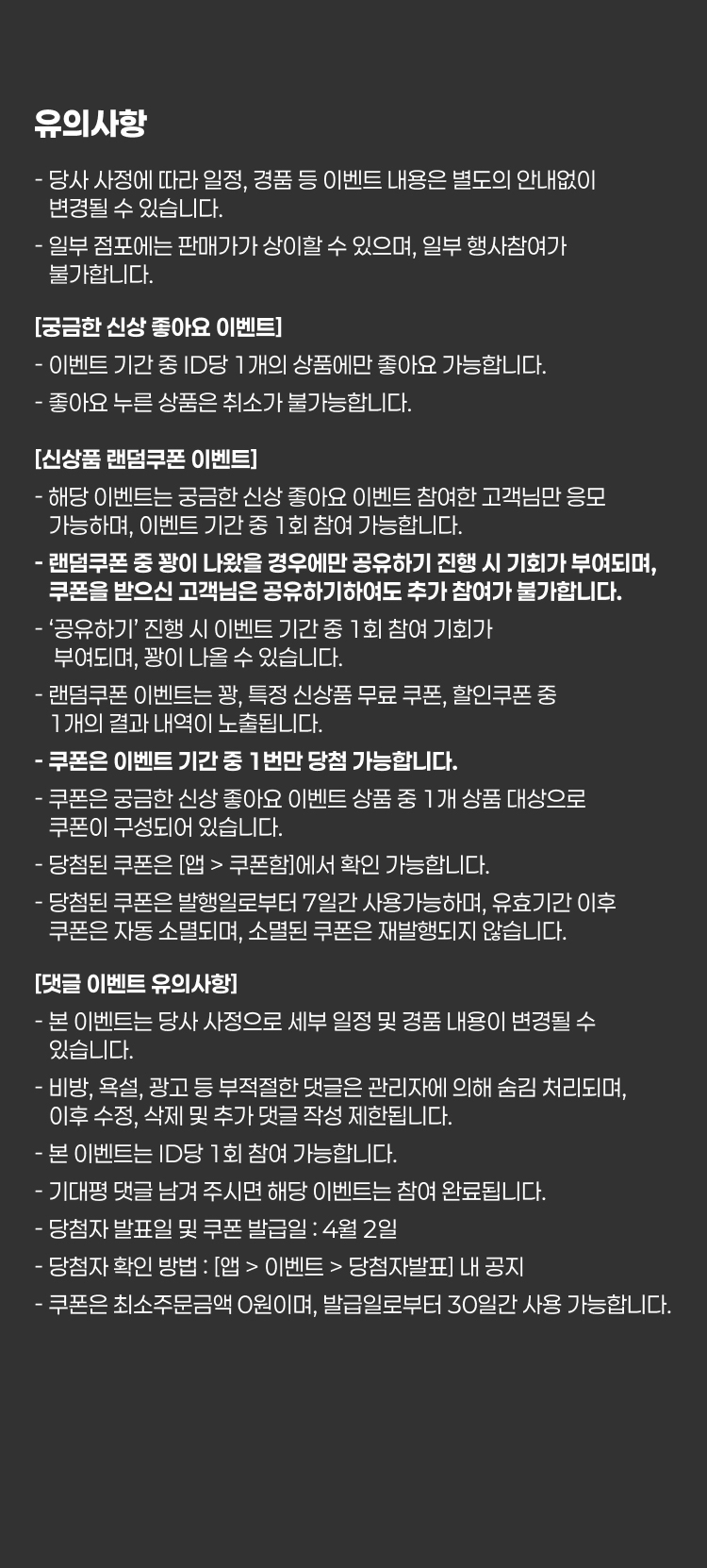 - 쿠폰은 궁금한 신상 좋아요 이벤트 상품 중 1개 상품 대상으로 쿠폰이 구성되어 있습니다.