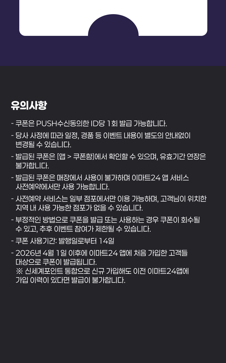 - 2026년 4월 1일 이후에 이마트24 앱에 처음 가입한 고객들 대상으로 쿠폰이 발급됩니다.