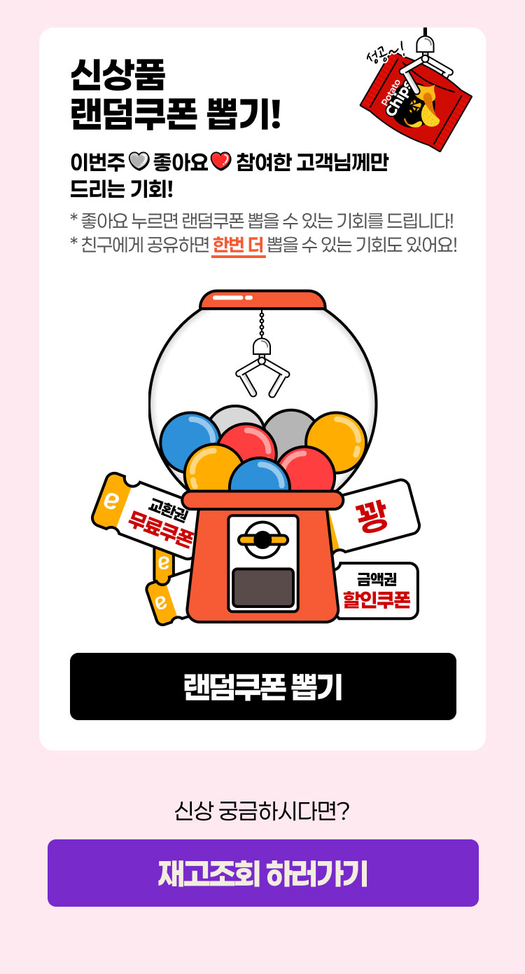 - 랜덤쿠폰 이벤트는 꽝, 특정 신상품 무료 쿠폰, 할인쿠폰 중 1개의 결과 내역이 노출됩니다.