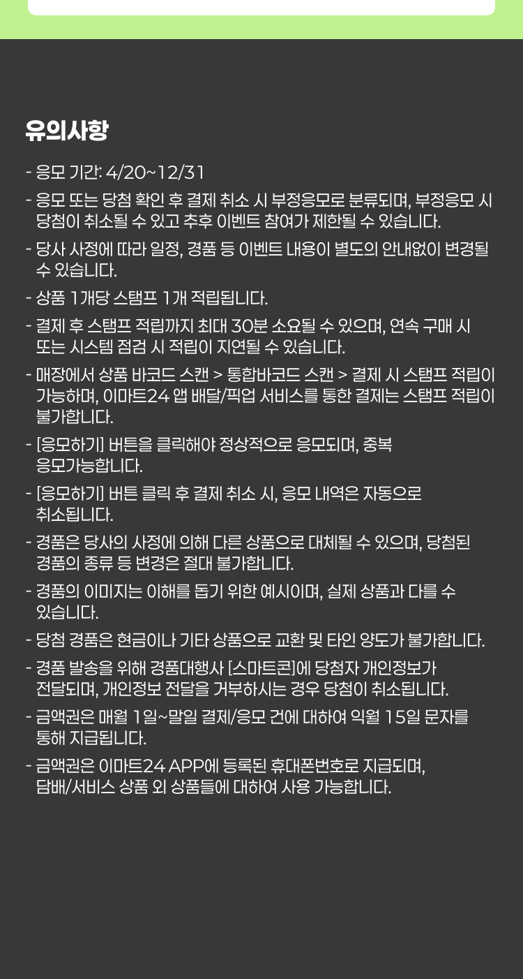 - 금액권은 이마트24 APP에 등록된 휴대폰번호로 지급되며, 담배/서비스 상품 외 상품들에 대하여 사용 가능합니다.