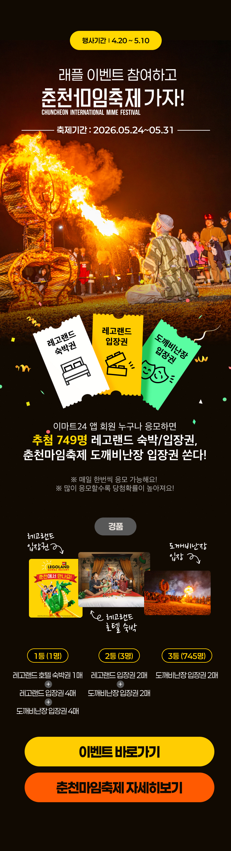 - 레고랜드 입장권의 사용기간은 2026년 5월 18일부터 2026년 6월 19일까지이며, 춘천마임축제에서 지류 우편으로 발송드릴 예정입니다.
