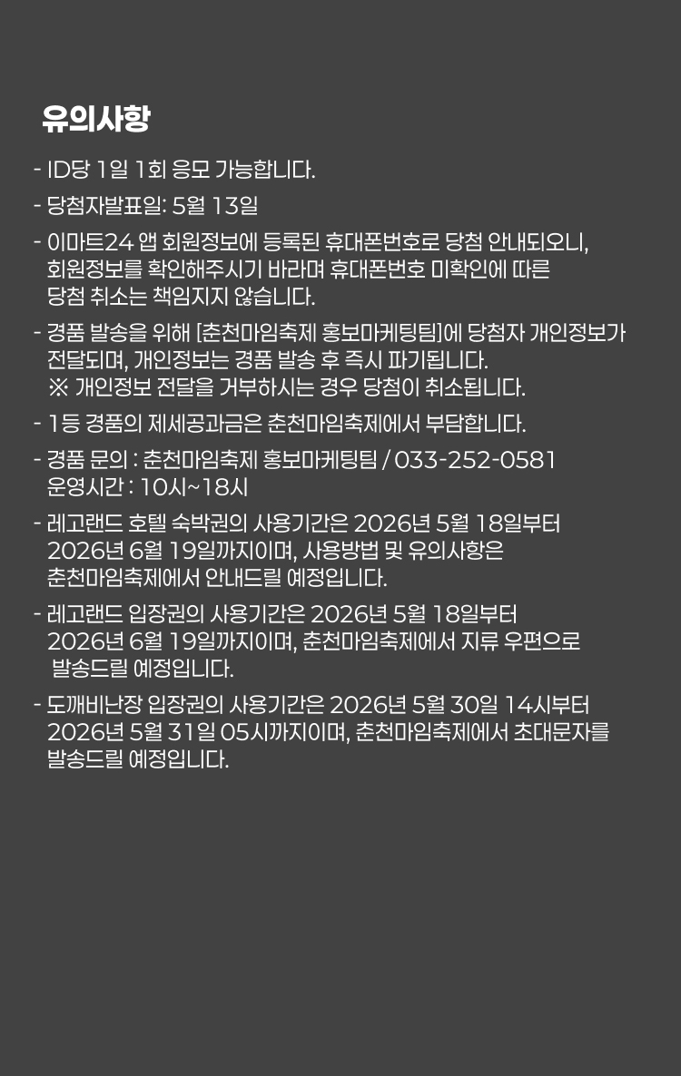 - 경품 문의 : 춘천마임축제 홍보마케팅팀 / 033-252-0581 운영시간 : 10시~18시
