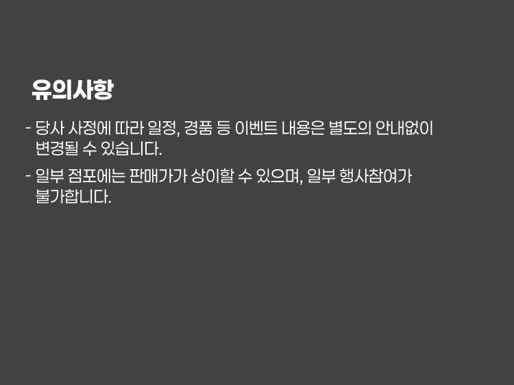 - 당사 사정에 따라 일정, 경품 등 이벤트 내용은 별도의 안내없이 변경될 수 있습니다.